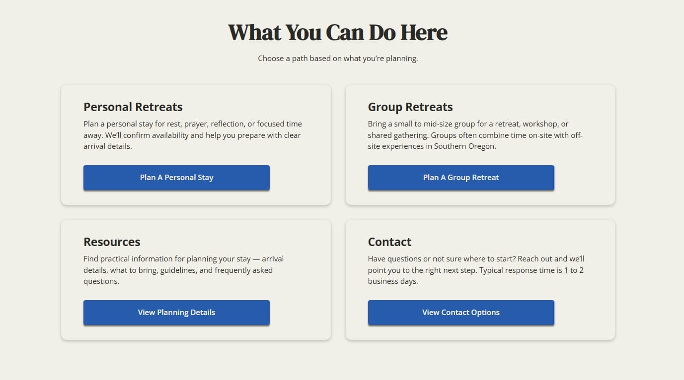 Booking relied on back-and-forth communication with little structure. We introduced a guided inquiry flow aligned with availability and retreat types.